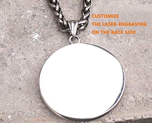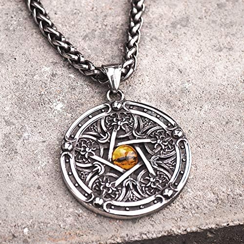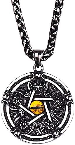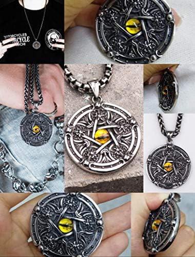 Il s’agit d’un pendentif distinctif conçu sous la forme d’un pentacle, accompagné d’un « mauvais œil » de couleur jaune. C’est une pièce de bijoux de style punk conçue spécifiquement pour les hommes. Il est fabriqué en acier titane résistant pour assurer sa durabilité. Le pendentif est suspendu à une chaîne de 28 pouces.