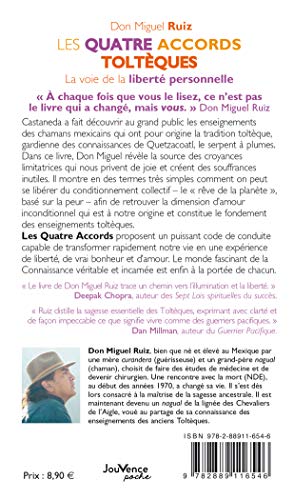 Castaneda nous a introduit à l’immense richesse des enseignements des chamans du Mexique ancrés dans la tradition toltèque, une tradition qui perpétue les connaissances de Quetzacoatl, le serpent à plumes. Don Miguel, à travers ce livre, nous fait découvrir la source de nos croyances restrictives qui nous dépossèdent de la joie et engendrent des souffrances superflues. Il explique de manière simple et abordable comment s’extraire du conditionnement collectif – ce qu’il nomme le rêve de la planète basé sur la peur – pour réintégrer la dimension d’amour inconditionnel qui est à la racine de notre être et qui est au cœur des enseignements toltèques. Les quatre accords proposent un code de conduite puissant qui a le potentiel de transformer radicalement notre existence en une expérience de liberté, de bonheur authentique et d’amour. L’univers captivant de la Connaissance au sens vrai et incarné est finalement accessible à tous.
