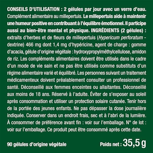 Notre formule préfère mettre l’accent sur un ingrédient actif : l’extrait de Millepertuis. D’une concentration dix fois plus élevée que la poudre standard de cette plante, notre extrait offre une efficacité décuplée. De ce fait, deux gélules par jour suffisent pour obtenir 466 mg d’extrait, ce qui est bien supérieur à la moyenne du marché.