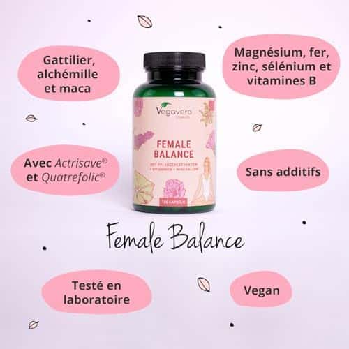 Les ingrédients que nous avons sélectionnés dans notre Hormone Balance Femme sont conçus pour aider à rééquilibrer naturellement le niveau d’hormones féminines (estrogène et progestérone). Ils sont notamment composés d’extraits de Gattilier (Vitex Agnus Castus), de riz noir et de figue, qui aurait des effets bénéfiques sur la peau. L’Alchemille (Alchemilla Vulgaris) et la Maca rouge (Lepidium Meyenii) ont également été ajoutées au mélange, de même que du fer, du magnésium, du sélénium, du zinc et des vitamines B (B2, B6, B9, B12) reconnus pour leur contribution à la régulation de l’activité hormonale.