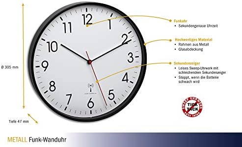 Grâce au signal DCF 77 émis par l’horloge atomique, l’horloge murale TFA est capable de recevoir l’heure à la seconde près. De ce fait, plus besoin de régler l’heure lors du passage à l’heure d’été ou d’hiver. Lorsque la batterie est presque épuisée, les aiguilles de l’horloge se stoppent, ce qui vous permet à la fois d’économiser de l’énergie et de changer la batterie au moment opportun.