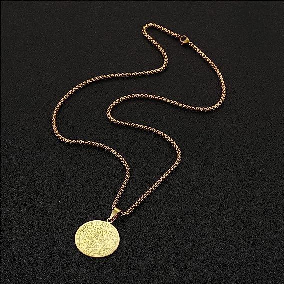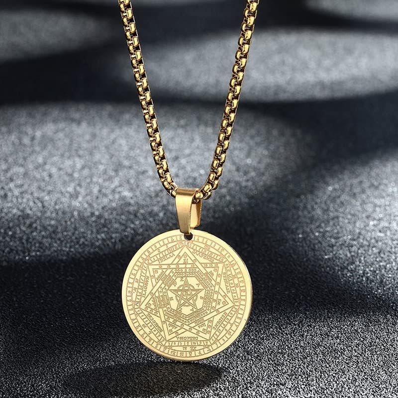 L’objet est un bijou confectionné à partir d’acier inoxydable. Plus précisément, il s’agit d’un collier dont le pendentif est un Pentagramme Talisman. Ce dernier mesure 30mm, tandis que la longueur de la chaîne du collier est de 55cm.