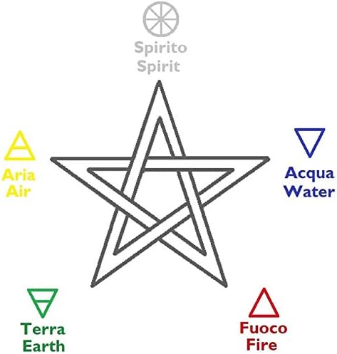 Ce somptueux pendentif issu de l’artisanat italien arbore le symbole des cinq éléments – Esprit, Air, Terre, Feu et Eau – sous la forme d’un pentagone étoilé. Cette représentation mystique confère au bijou une signification particulière et le rend unique.