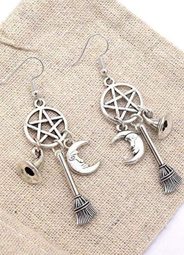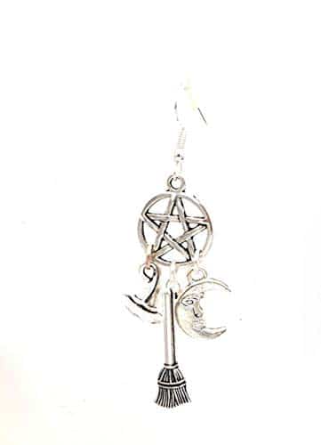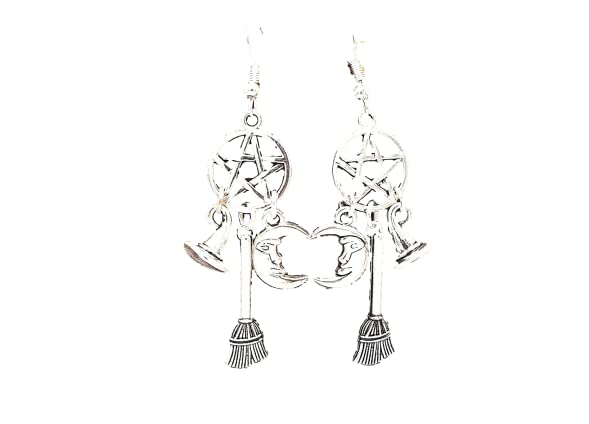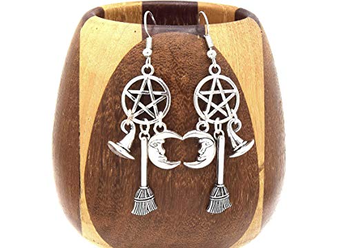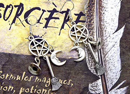 🌙 Boucles d’oreilles pentacle Wicca avec chapeau, balai et lune 🧙‍♀️