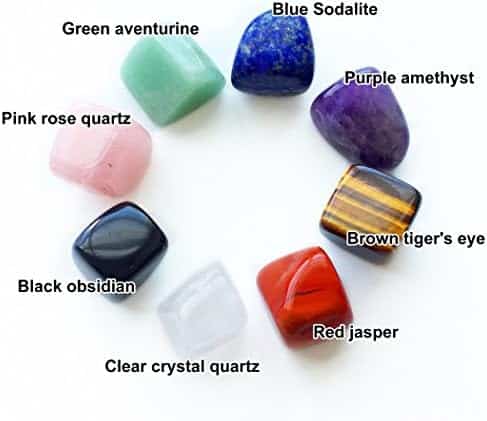 Voici la composition de l’ensemble: Aventurine (de couleur verte), Quartz rose (rose), Quartz clair (transparent), Œil de tigre (marron), Améthyste (violet), Jaspe (rouge), Sodalite (bleu), et Obsidienne (Noir).