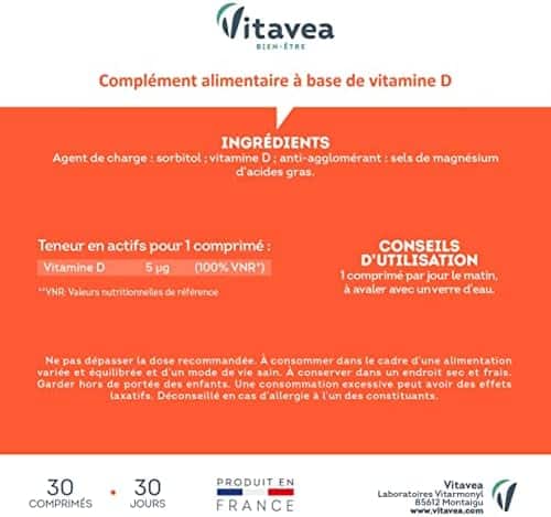 - Dosage adapté de vitamine D : fournit 100% des apports recommandés quotidiens en prenant un seul comprimé par jour